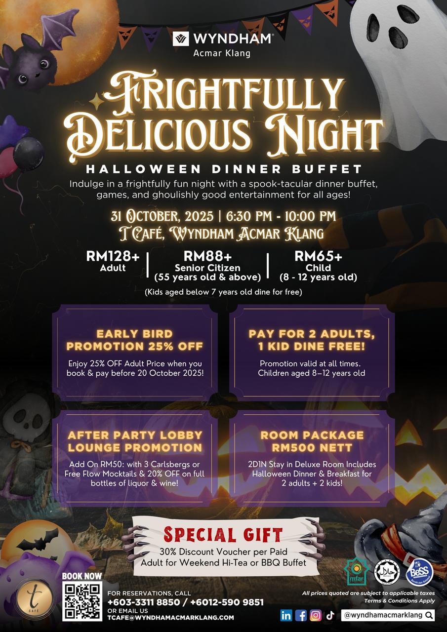Step into a night of spooks and delights where eerie fun meets delicious excitement! Join us this 31 October 2025, from 6:30 PM – 10:00 PM at T Café, Wyndham Acmar Klang for a Halloween Activity Night that promises ghoulishly good entertainment for all ages. Come dressed in your best spooky outfit and stand a chance to win amazing prizes!