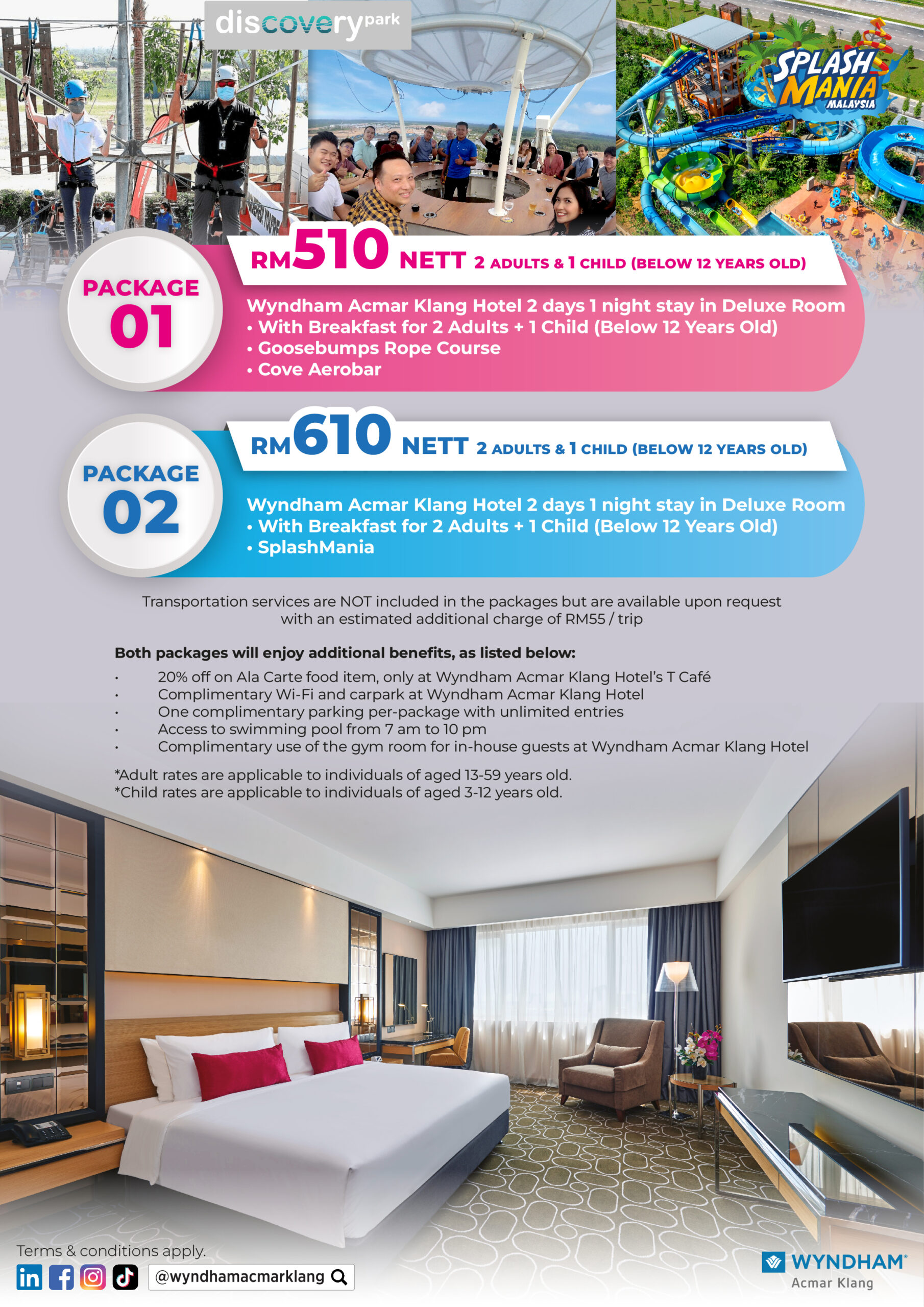 Embark on an unforgettable journey of wonder and excitement at Wyndham Acmar Klang Hotel! We invite you to indulge in the ultimate escape with our exclusive 2 Days 1 Night Deluxe Room Stay promotion. Experience the finest hospitality, breathtaking views, and thrilling adventures that will create cherished memories for you and your loved ones. Attractions such as Goosebumps Rope Course, Cove Aerobar & SplashMania at Gamuda Cove.