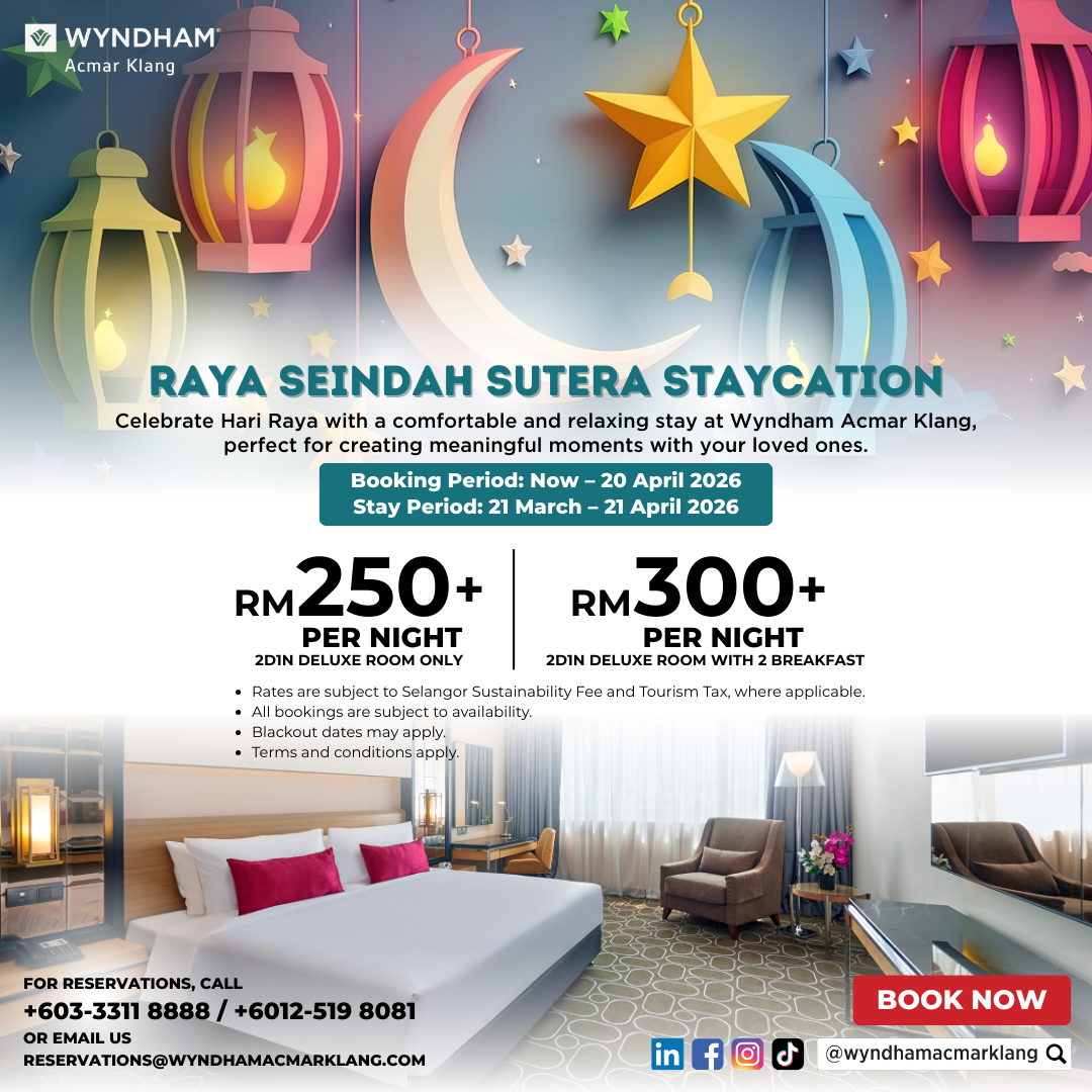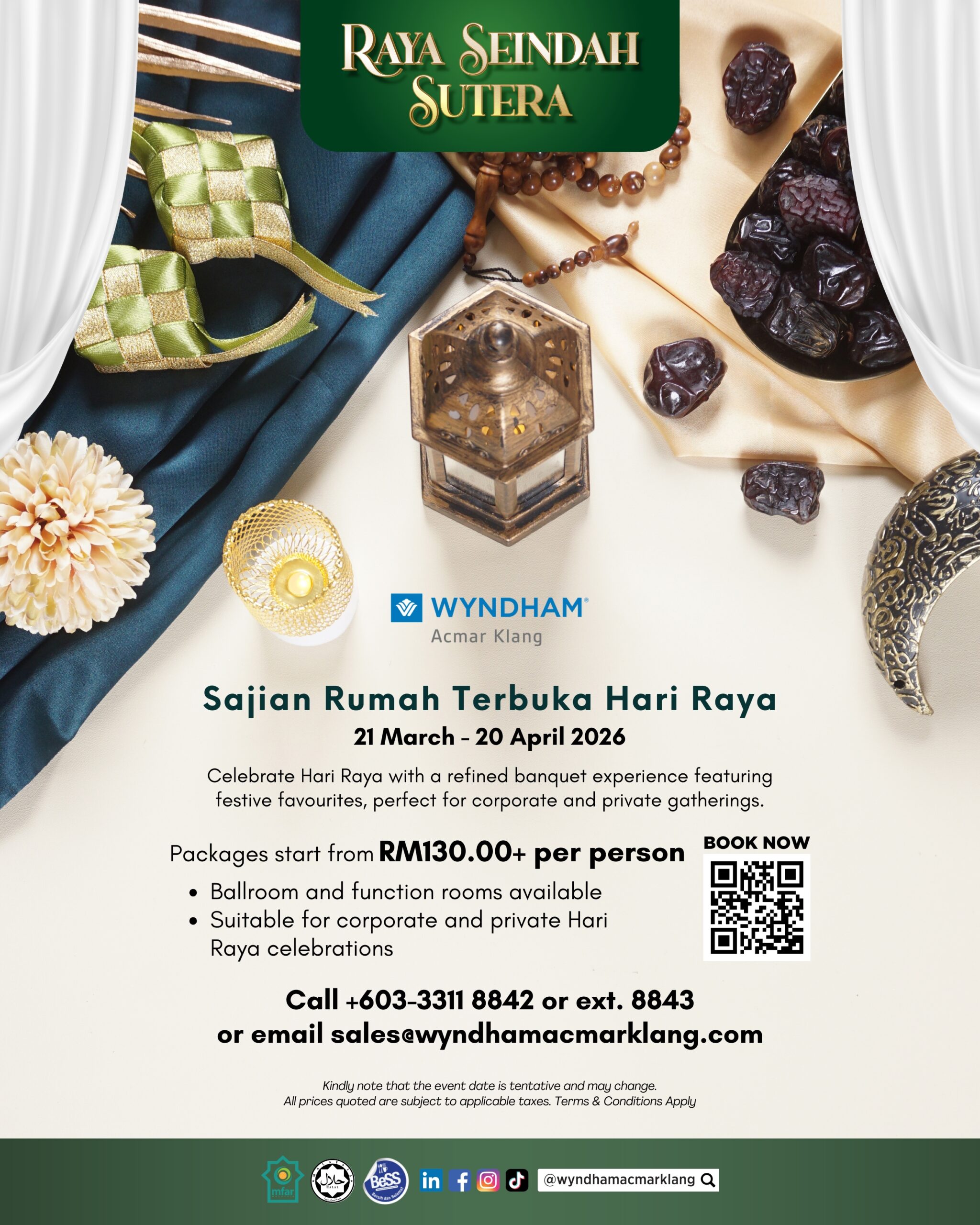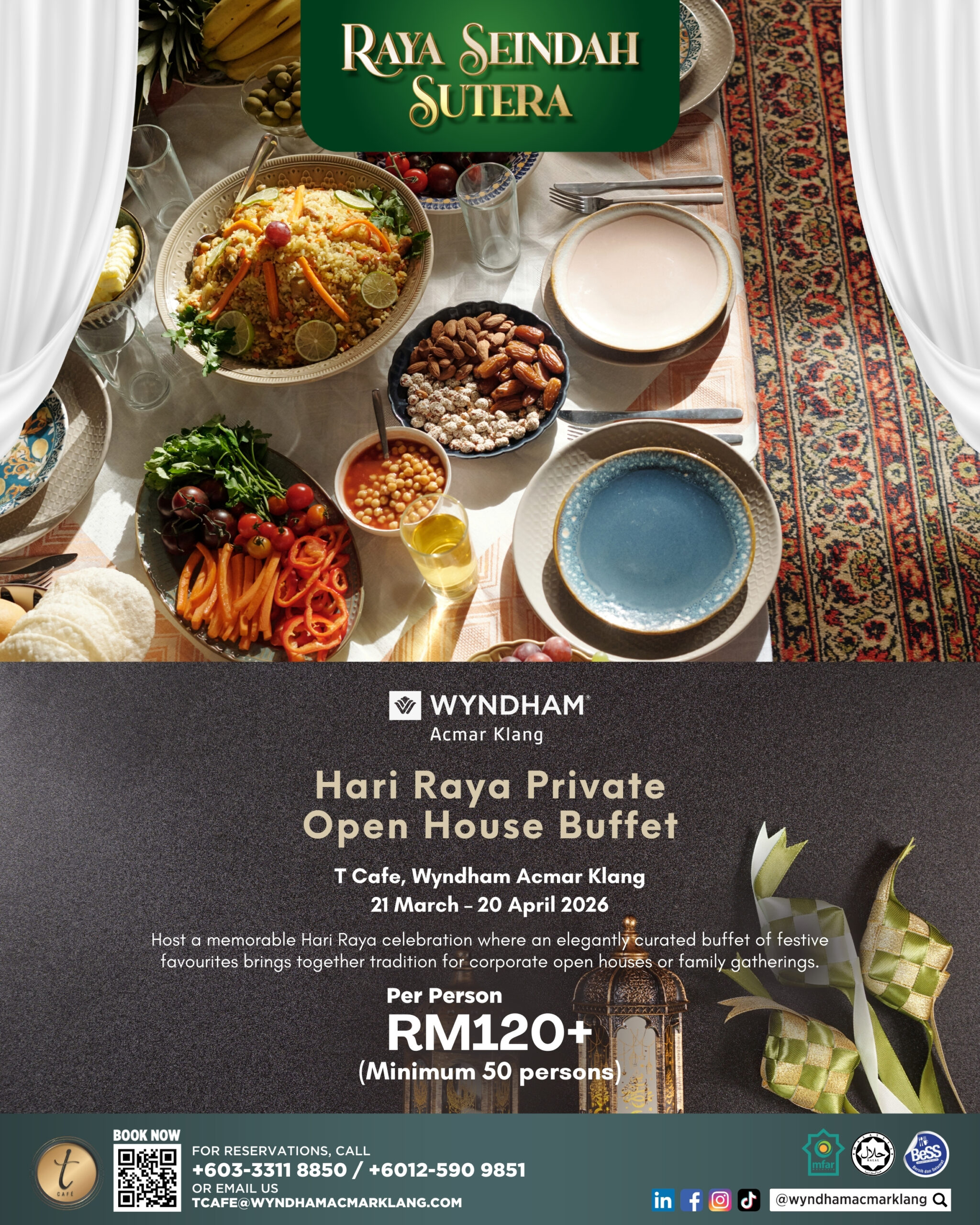Celebrate the spirit of Syawal with a memorable private open house at T Café, Wyndham Acmar Klang. Host your corporate gathering or family celebration while indulging in a beautifully curated buffet spread of festive Raya favourites.