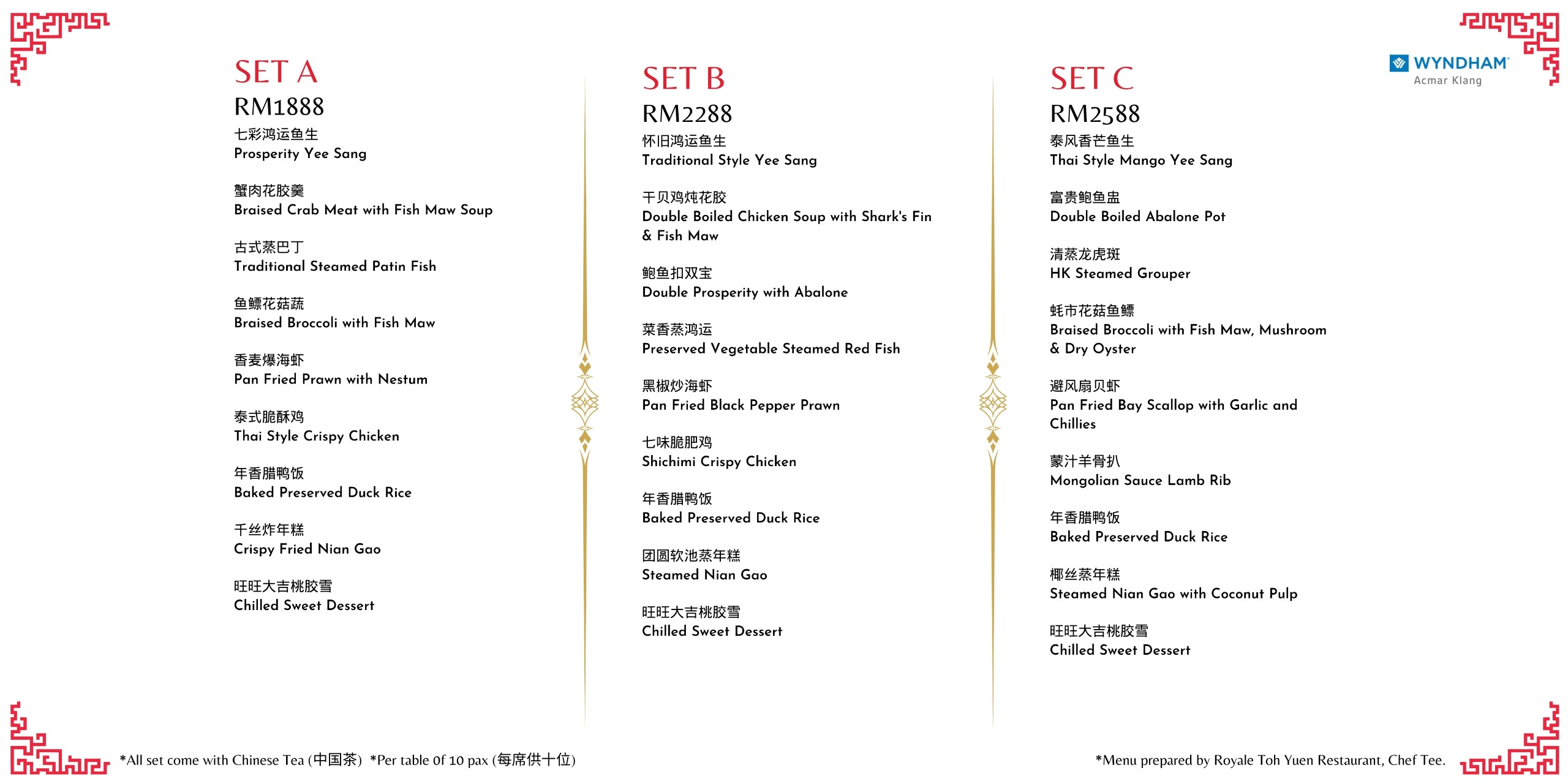 Choose from our luxurious CNY set packages, starting from RM1,688 to RM2,588, and elevate your celebration with opulence and grandeur.